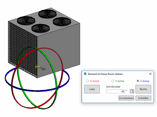 Die Funktion Rotieren Elemente existiert schon seit einiger Zeit. Diese Funktion ist z.B. nützlich, um einen Anlagenraum in Ihrer Grundrissansicht zu zeichnen und anschließend zu drehen. Neu ist die Funktion Element im freien Raum drehen. Mit Element im freien Raum drehen können einzelne Revit-Familien, Baugruppen und Gruppen im freien Raum gedreht werden. Da die Startposition gespeichert wird, können Sie die Familie auf Knopfdruck wieder in diese Position bringen.